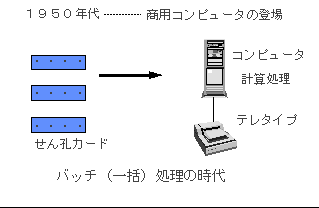 1950年代コンピュータといえば、計算を高速に行うための電子計算機として考えられてました。 コンピュータの入力はせん孔カード、出力はテレタイプという形式が主流で、コンピュータも与えら れた仕事を一つずつ順番に処理していくバッチ(一括して処理すること)形式の処理を行っていました。