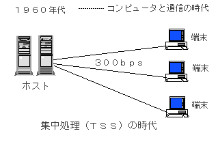 1960年代に入り、タイム・シェアリング・システム(TSS:Time Sharing System:時分割システム) と呼ばれる新しい技術が広まり、コンピュータの利用形態には大きな変化がもたらされました。 TSSでは、バッチ処理とは異なり、同時にいくつもの仕事を受け付け、短い時間間隔ですべての 仕事を次々に処理していくので、前の仕事が完了していなくても、コンピュータに次々に仕事を依頼することが 出来るようになりました。
