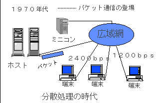 70年代に入りTSSのコンピュータ・システムが数多く設置されるようになりますと、 今度は他のコンピュータのファイルにアクセスしたり、ログインしてプログラムを実行したいという 要求がでてきました。このような要求に応えるために、データ通信ネットワークを利用して、 コンピュータ同士を接続し、利用者が一つのコンピュータから別のコンピュータへと渡り歩いたり、 別のコンピュータからファイルをコピーしたりというように、あたかも自分が直接そこに接続されているか のようにして別のコンピュータを利用することができるような技術が開発されました。