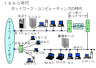 また、マルチプロトコル・ルータの登場などによるインターネットワーキング技術はLANとLANの間の壁や、 地理的な距離の壁を越えたグローバルなネットワーク・コンピューティグ環境を構築することを可能にしました。現在、 ソフトウェアの間では、通信プロトコルとサーバの技術が異機種のコンピュータを結んだネットワーク・コンピューティグ の基礎となりその上で様々なサービス、グループウェアなどのソフトウェア、クライアント・サーバ方式などの最新テクノロジー が展開されています。