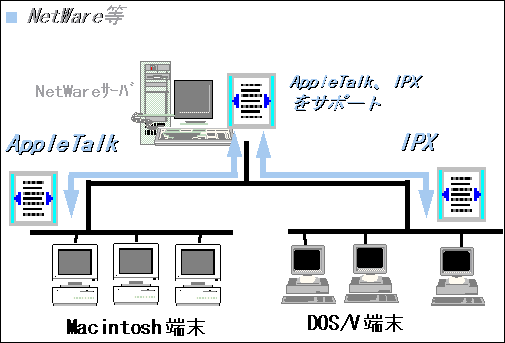 ノベルのNetWareは、当初よりNOSの機能を多く取り込み、 ネットワークOSの代名詞のような位置づけとなっています。最初の日本語版は1991年 に発表され、現在は中規模ネットワーク向けのNetWare3.12Jと大規模ネットワーク向け のNetWare4.1Jが出ています。